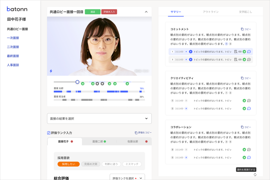 『batonn(バトン)』は、企業の採用力を向上させるオンライン面接支援ツールです。面接の自動文字起こしやAI要約機能を活用し、候補者の発言をエビデンスとして蓄積することで、面接の属人化を防ぐ「積み上げ型面接」を実現します。