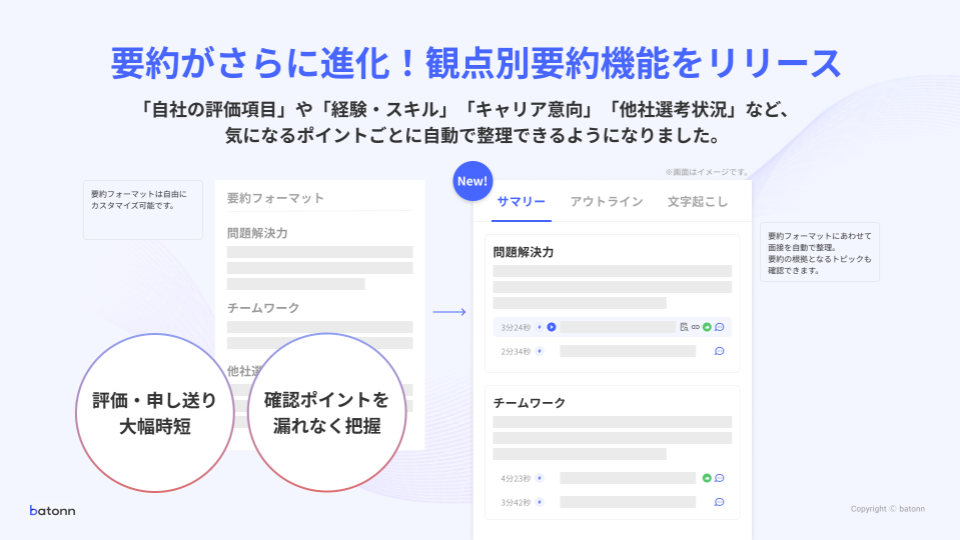 株式会社リブセンス(代表取締役社長:村上太一、本社:東京都港区、証券コード:6054)が提供する、オンライン面接ツール『batonn(バトン)』(URL:https://batonn.io/)は、最新バージョンの提供を開始しました。OpenAIのChatGPTを活用して、従来からある時系列での面接内容の要約に加え、採用基準ごとにポイントを自動で整理する「観点別要約機能」が追加拡張されました。