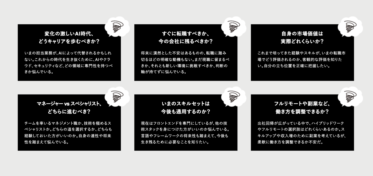 キャリアアドバイザーが実施する「キャリアの壁打ち」では、ITエンジニアが抱える以下のような悩みや「業務を通じてどのような生き方をしたいか」をヒアリングし、キャリア観を客観的に把握・分析します。ヒアリングした内容について、転職ドラフトが持つ独自のフレームワークを用いて、相談者それぞれに合わせたキャリアシート(Your Core Values)を作成します。