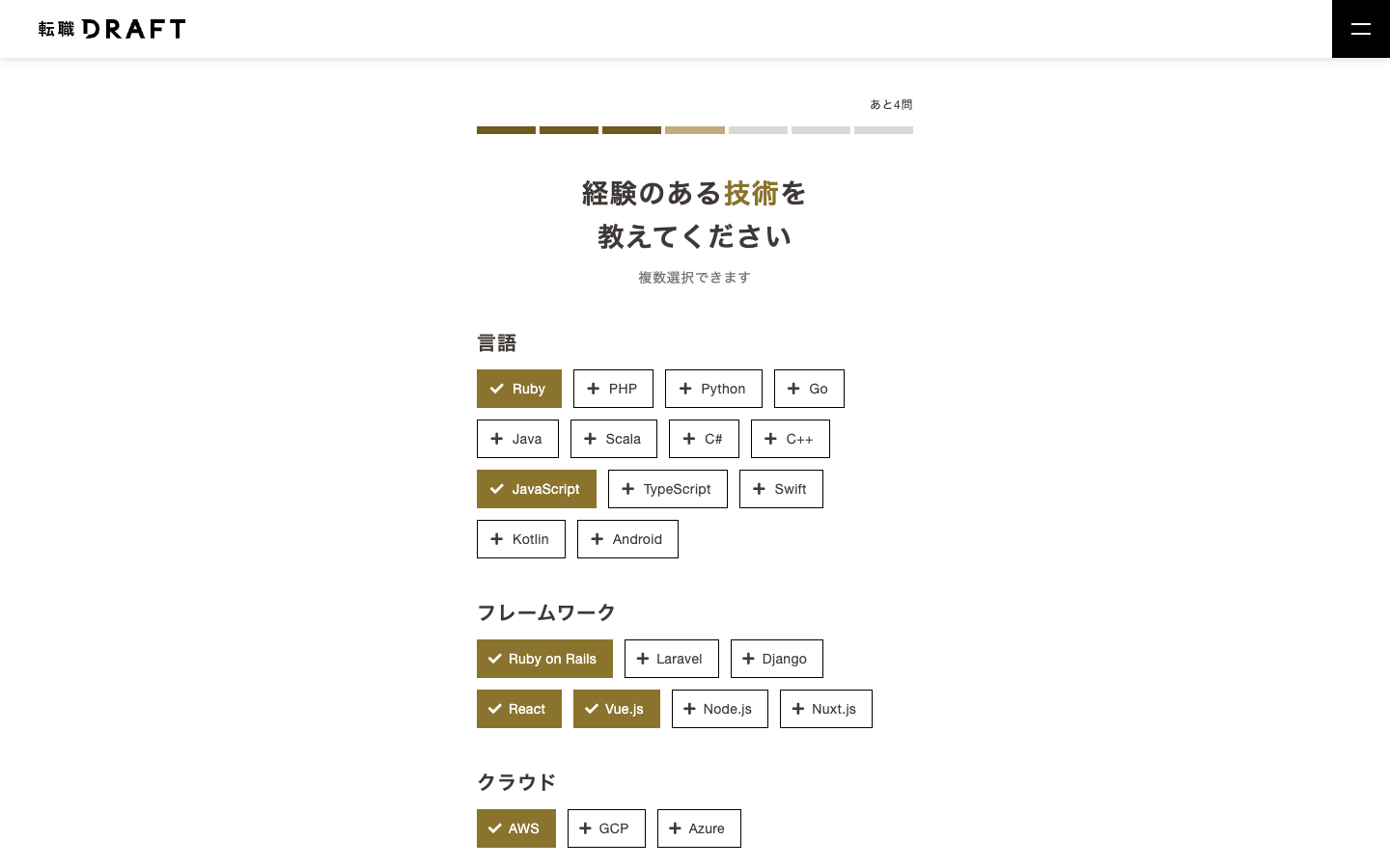 現在の職種と経験年数、プログラミング言語ごとの経験、役職経験など、エンジニアのキャリアに特化した簡単な質問(全X問)に回答していきます。