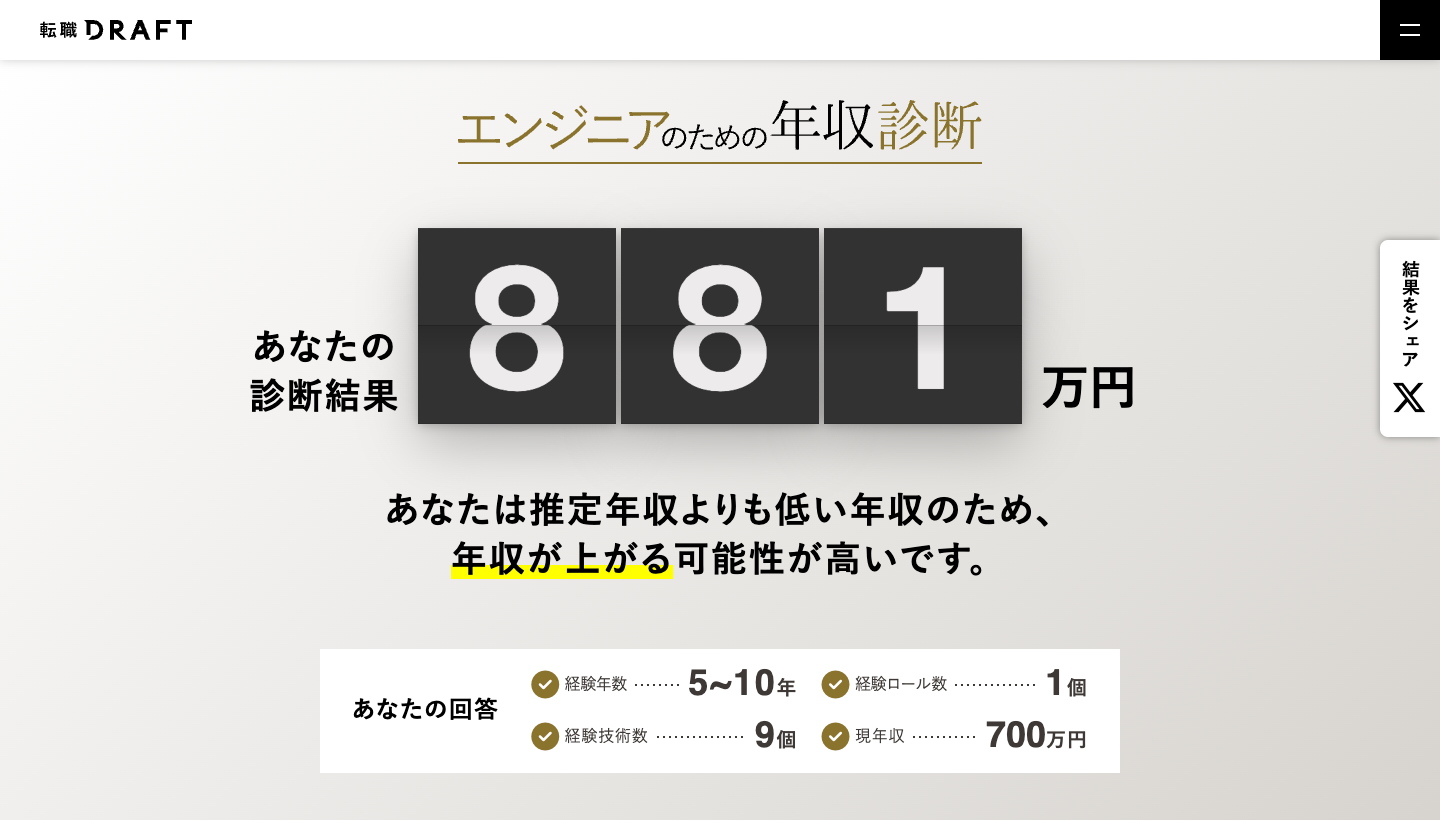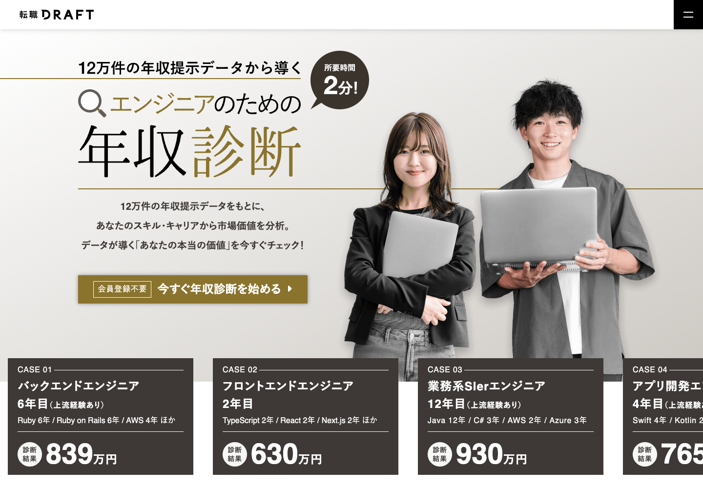 転職ドラフト、ITエンジニアのリアルな市場価値がわかる 『年収診断』機能を提供開始 転職ドラフトが保有する過去12万件の年収提示データをもとに、 インフレ率やITエンジニア特有の経験も考慮した高精度な診断