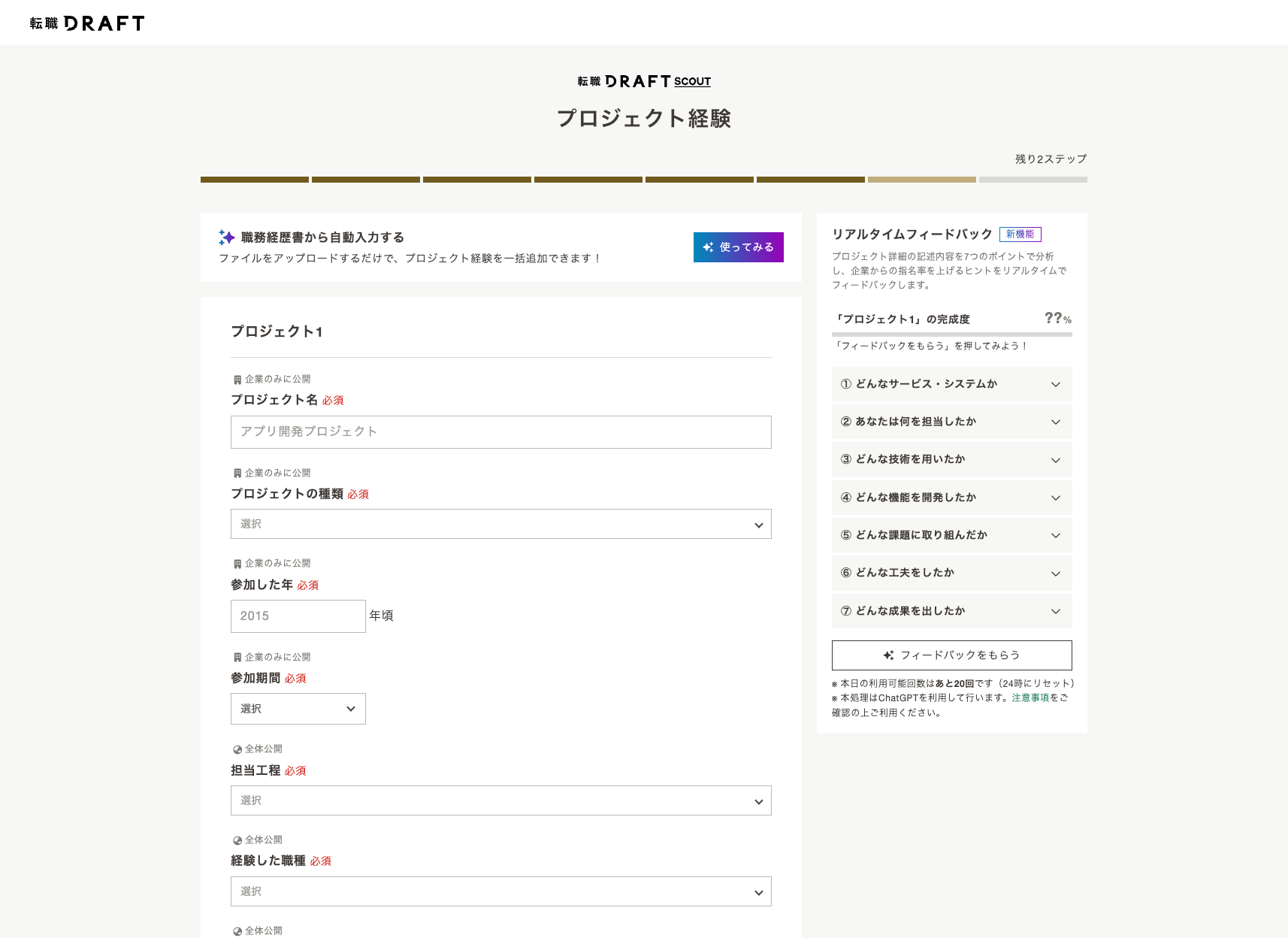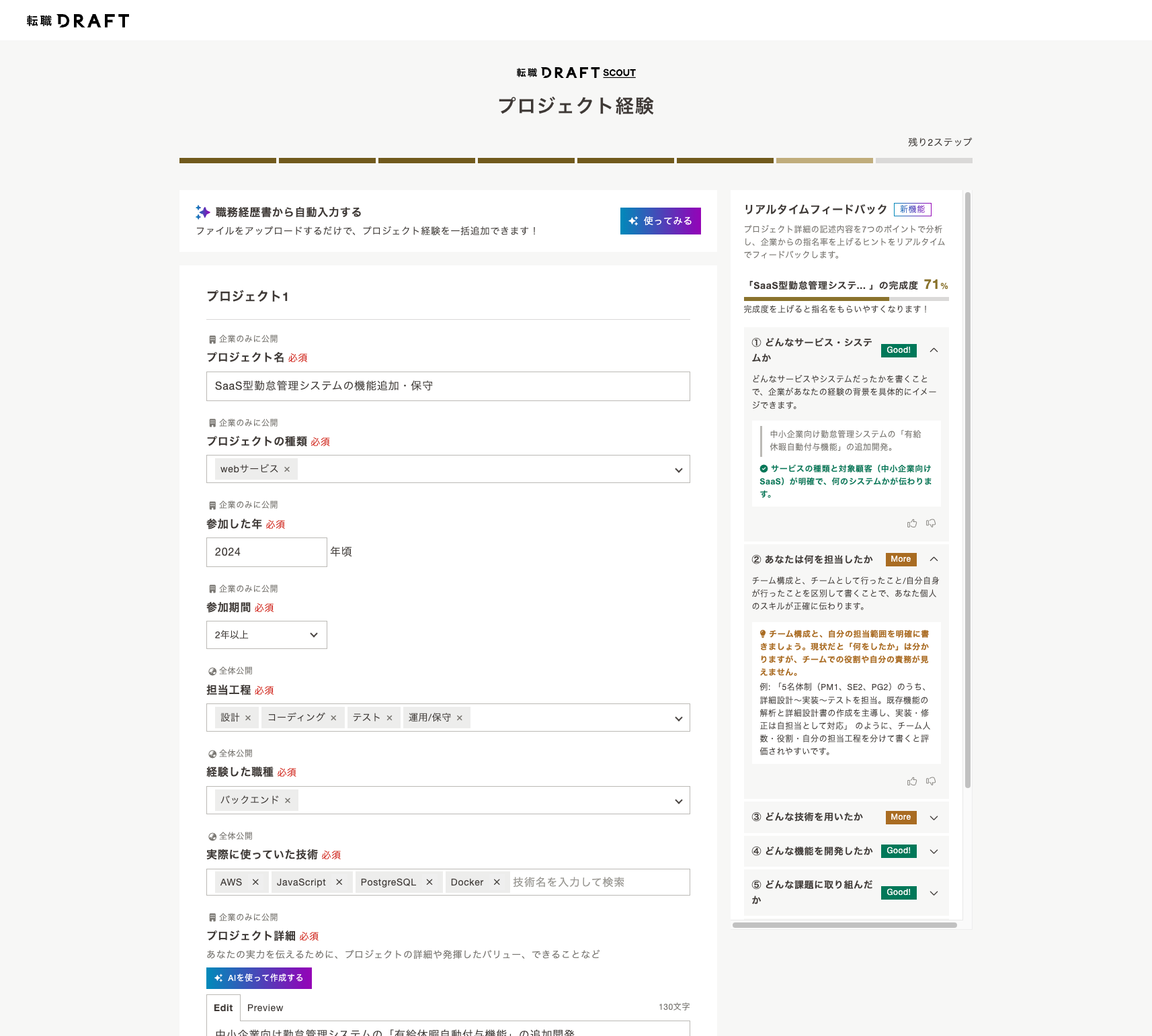 株式会社リブセンス(代表取締役社長:村上太一、本社:東京都港区、証券コード:6054)が運営する『転職ドラフト』(URL:https://job-draft.jp/)は、企業からの指名獲得に向けた「プロジェクト経験」の作成をサポートする「リアルタイムフィードバック機能」を提供開始しました。これまで「どう書けば魅力が伝わるかわからない」と悩んでいた求職者がも、経験やスキルを魅力的に企業に伝える質の高い職務経歴書(レジュメ)を作成でき、企業からより良いスカウトを獲得する可能性を高めることが期待できます。本機能は現状では新規会員登録時に提供されるものですが、今後既存会員向けの同様のサービス提供を予定しています。